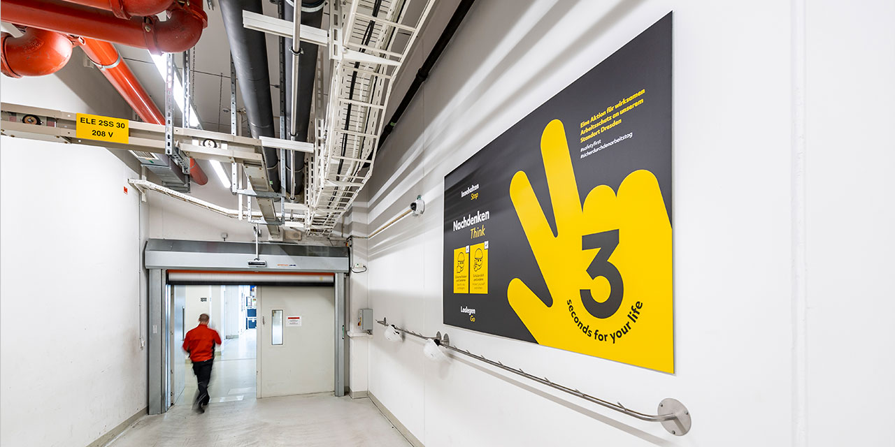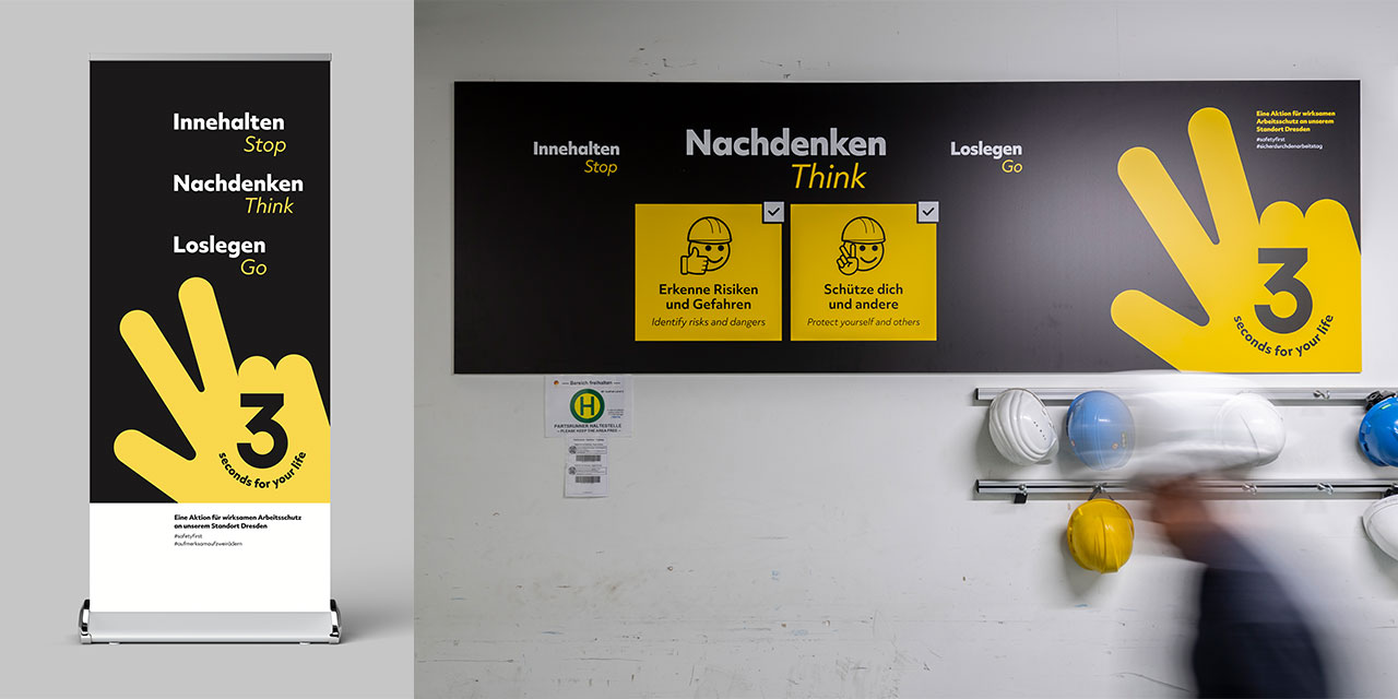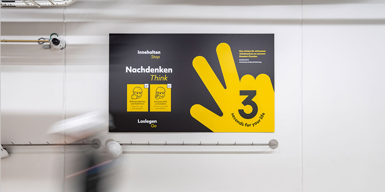 Die Arbeit und Produktion bei GF Dresden erfordert ein Gros an Ge- und Verboten, die Gefahr einer Informationsüberflutung ist dabei groß. Es stellte sich die Frage: Wie erreichen wir die Mitarbeitenden nachhaltig? Die Antwort ist eindeutig: Der kommunikative Ansatz darf keine „werbliche“ Ansprache oder Anmutung haben, muss reduziert, aufmerksamkeitsstark sowie plakativ in Erscheinung treten und soll schnell erfassbar sein.